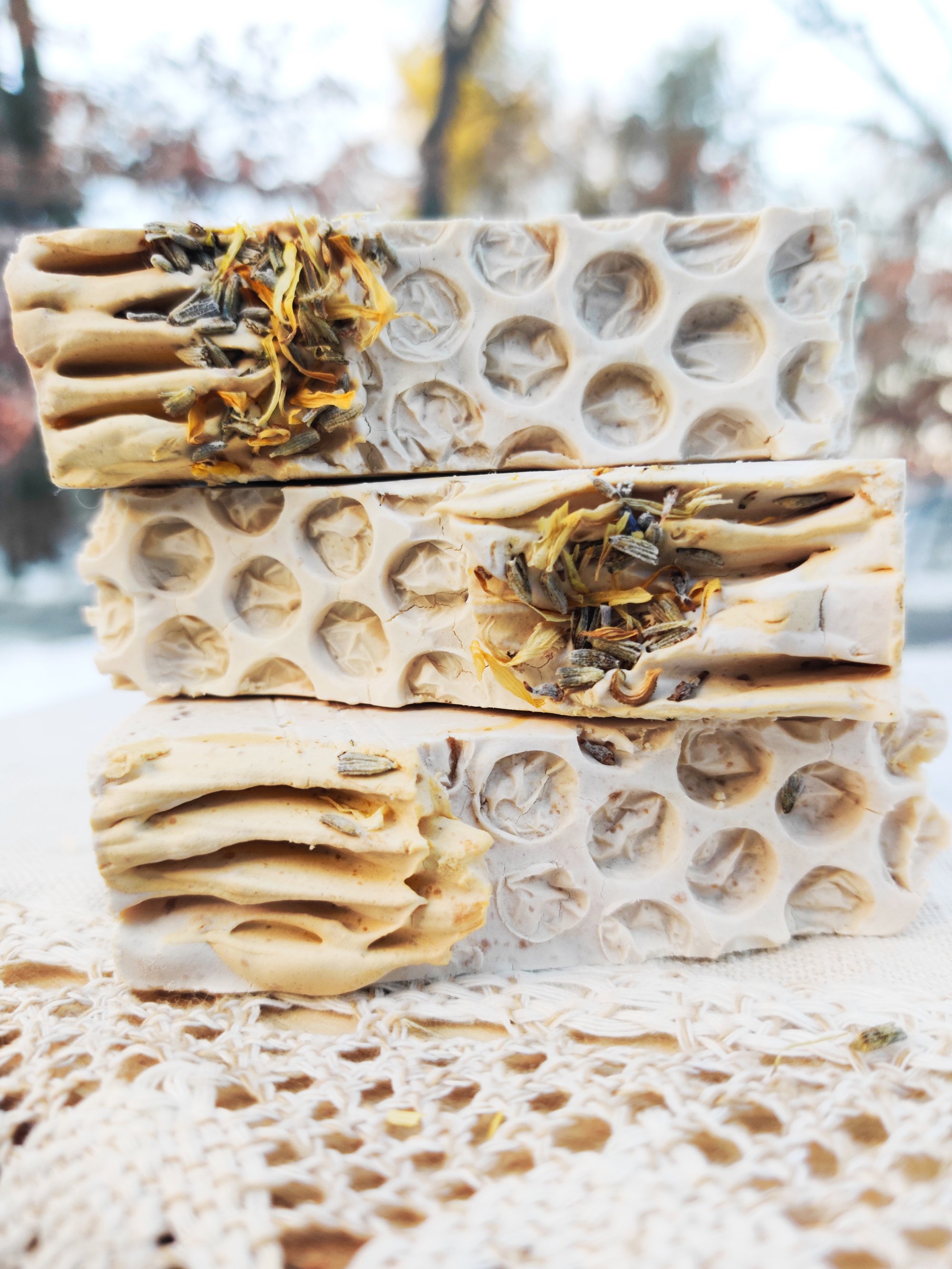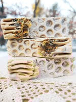 Saponified avocado oil, coconut oil, shea butter, palm kernel oil flakes, sunflower oil, castor oil, salt brine, fragrance oil, Tussah silk, Mica, oxide, dried calendula