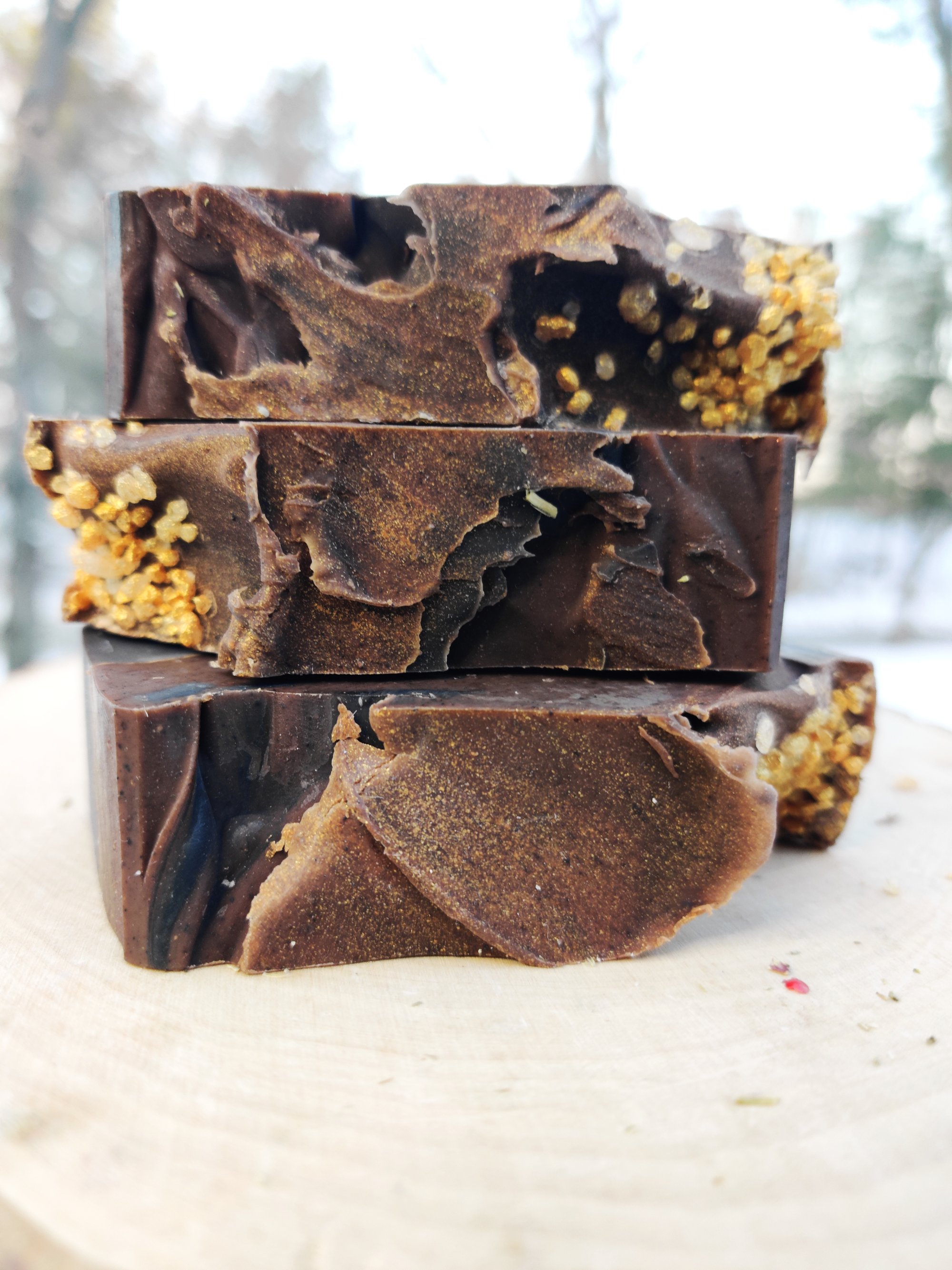 Avocado oil, Canola oil, Coconut oil. Mango butter, Castor oil, Rice bran oil, Palm oil, Activated charcoal, brown oxide, gold Mica, Sea salt, Sodium Lactate, Tussah silk, Chaga mushroom tea