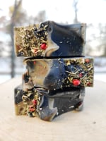 Saponified avocado oil, Canola Oil, Chaga mushroom tea, Coconut oil, Mango butter, Castor oil, Palm Oil, fragrance oil, Tussah silk, Sodium Lactate, Activated charcoal, brown oxide, Turmeric powder, red peppercorns, dried yarrow leaf